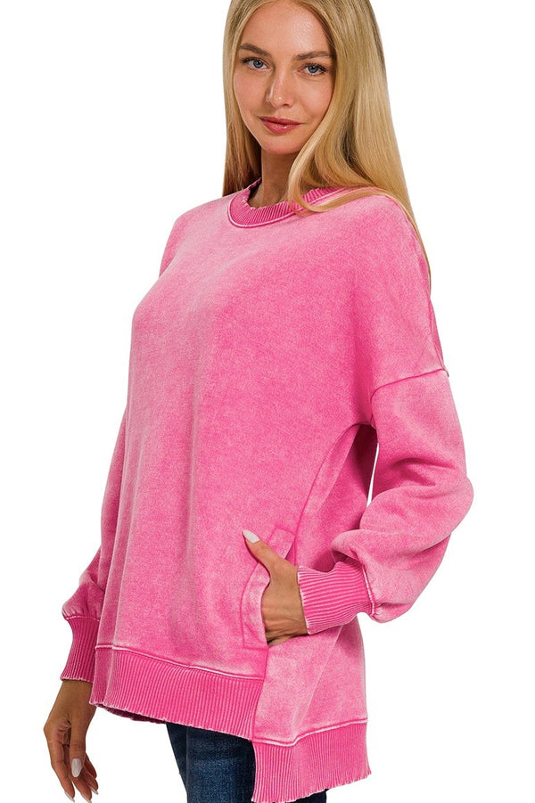 Acid Wash Hi/Low Pocket Sweater | Hot Pink