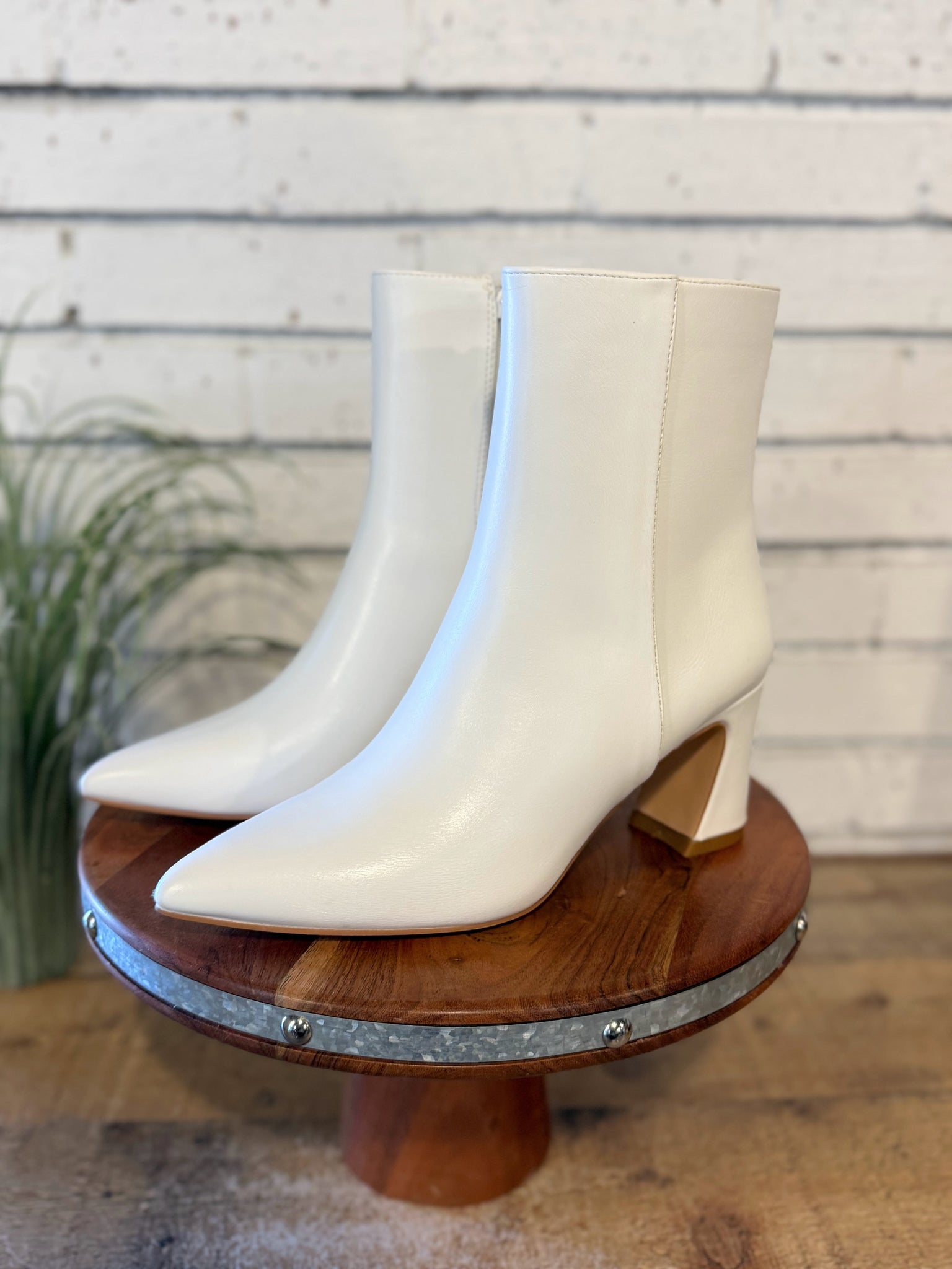 Gorgeous pointed toe slim design booties featuring a block hill, inside full zip up and faux leather.