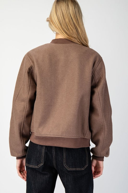 Solid long sleeve bomber jacket featuring a zipper front, a round neckline, banded cuffs, and a finished bottom band.