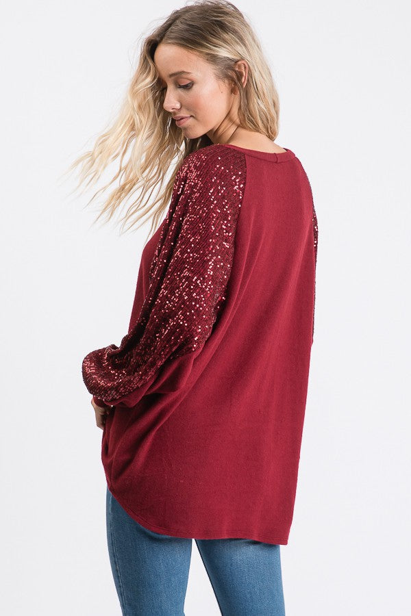 Super soft brushed knit top featuring a sequin contrast, bishop sleeves, curved hem and long sleeves!