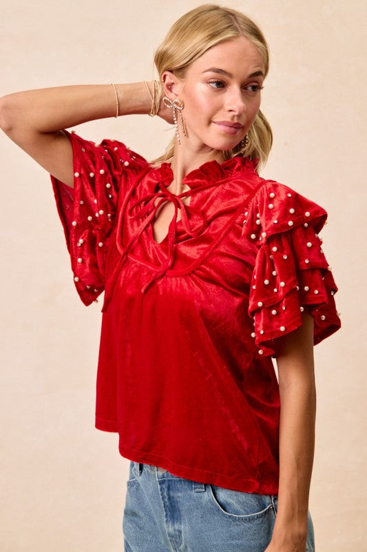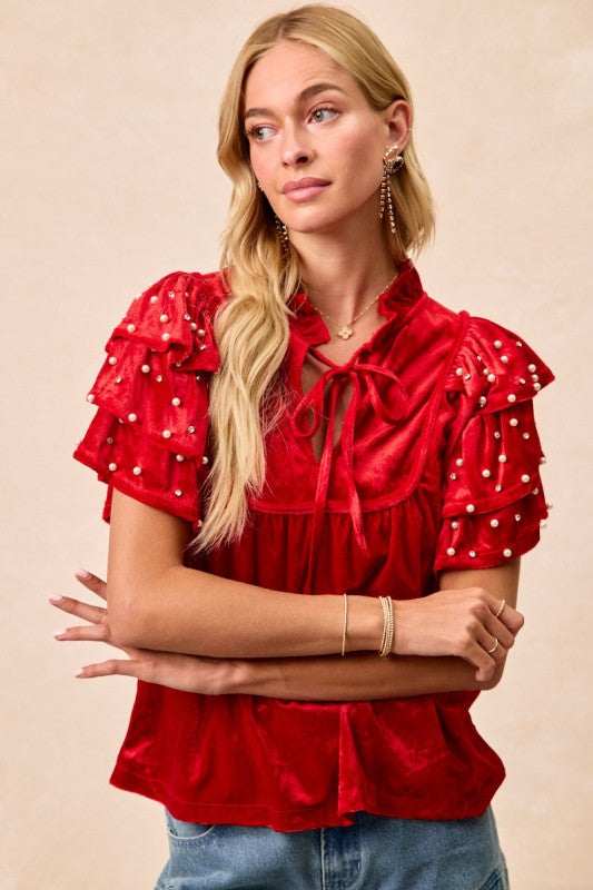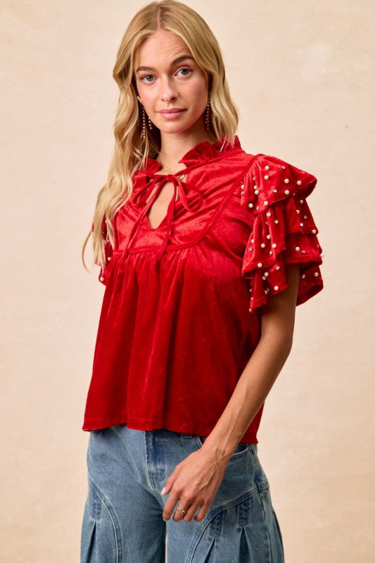 A gorgeous red velvet top featuring pearl details, front tie and ruffled sleeves. So fun, pretty and festive!