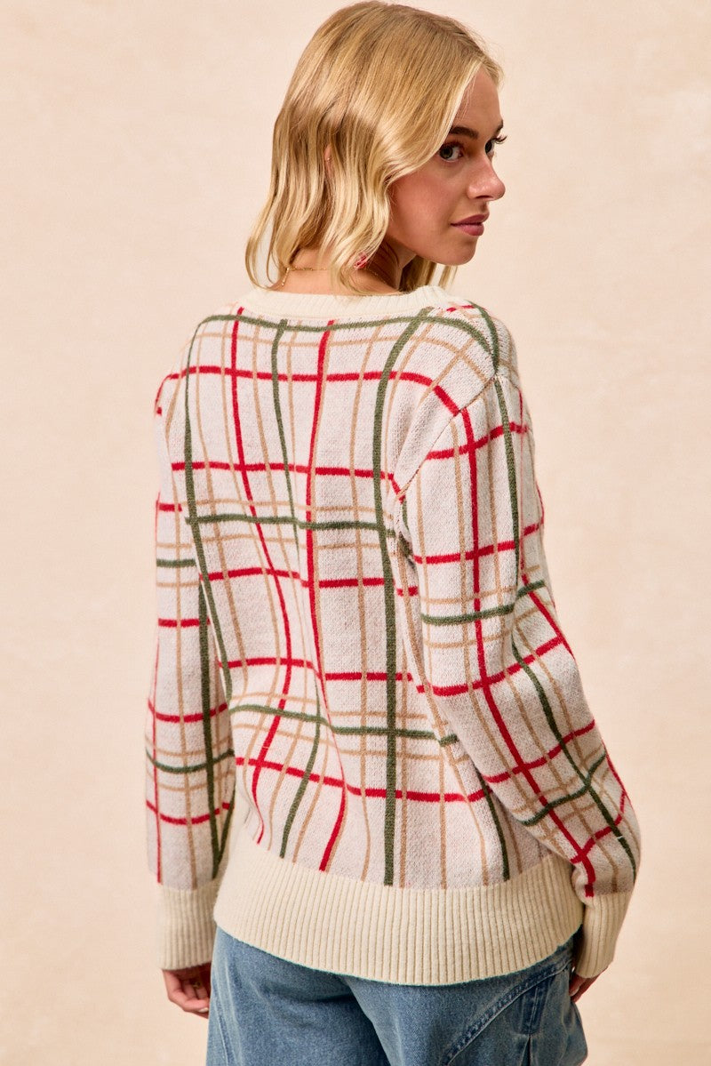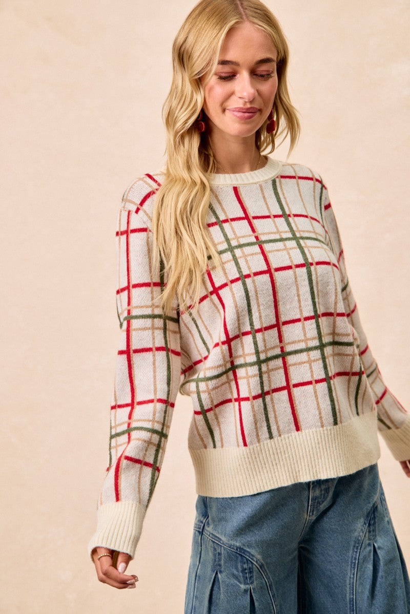 A festive Christmas plaid sweater top featuring a crew neck, banded hems and relaxed fit.