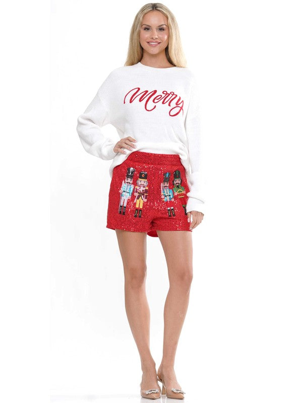 Sparkly sequin Nutcracker shorts featuring an elastic waist and relaxed fit.
