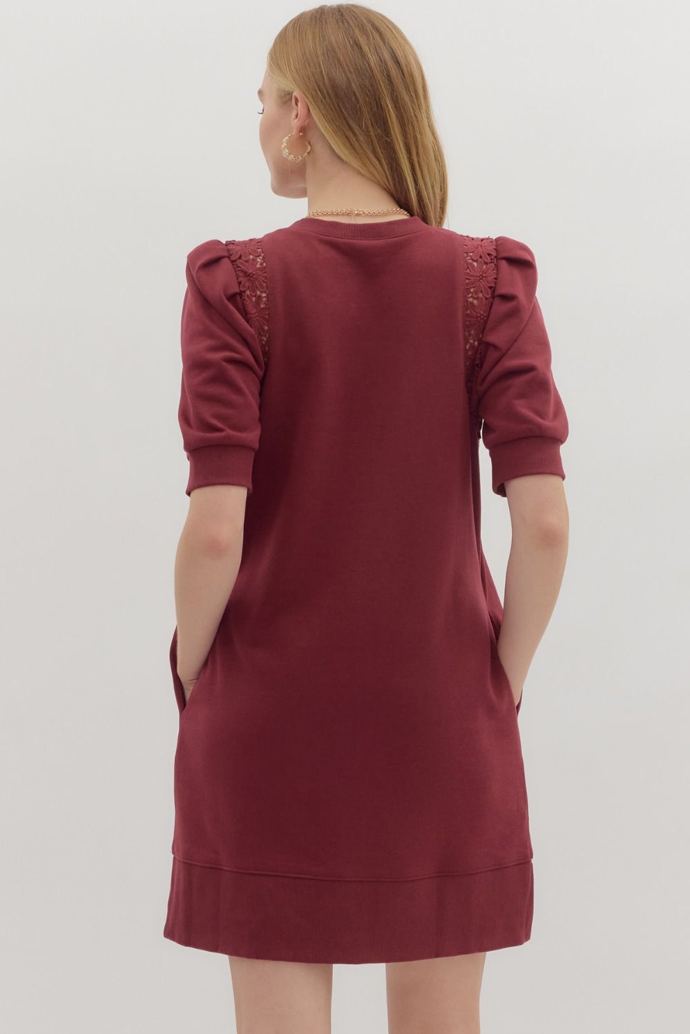 Crochet Trim Pleated Puff Sleeve Dress | Garnet
