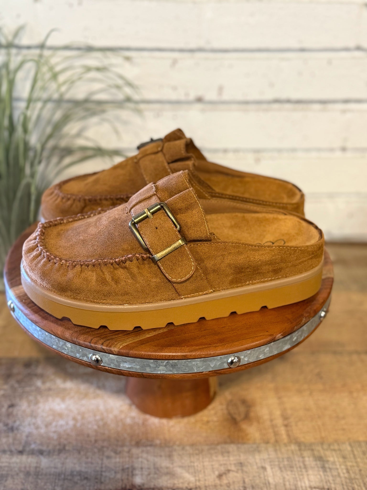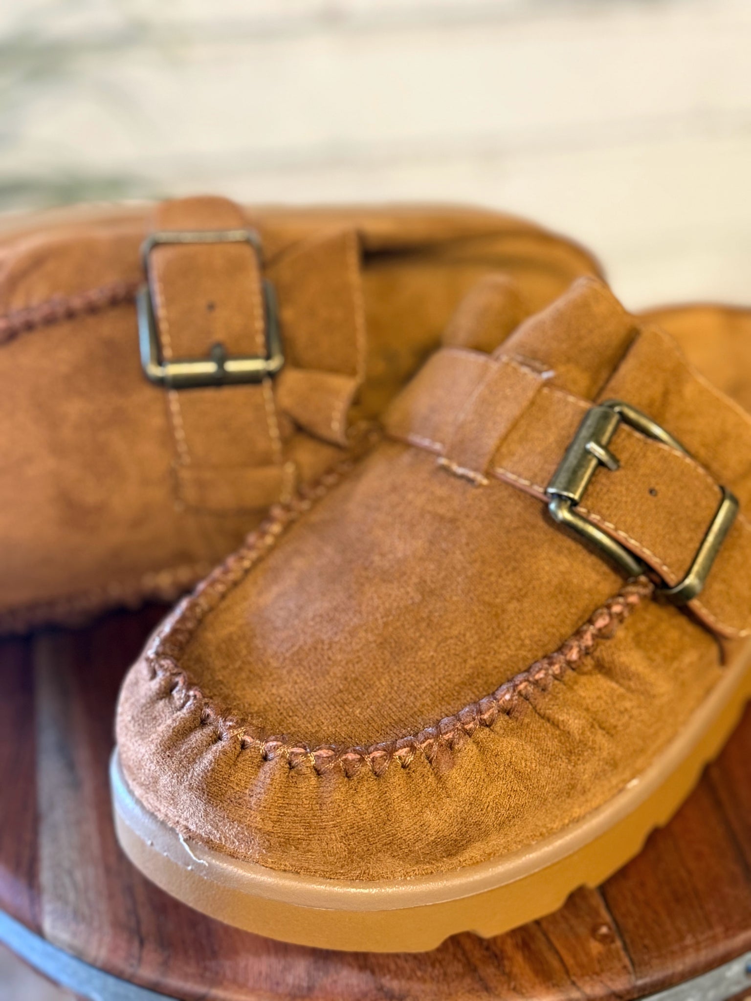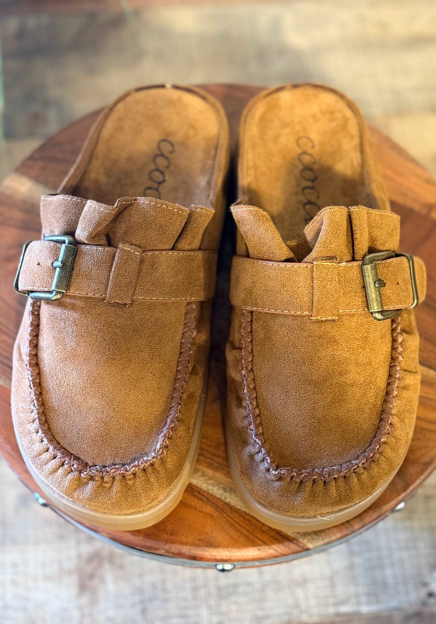 Elevate your comfort with our trendy mule design, blending the ease of moccasin slippers with modern flair. These semi-platform mules feature a stylish buckled strap detail and a charming ruffle entrance design. Delicate rippled vamp stitches complete the look, creating a unique and lovely aesthetic. Perfect for effortless slip-on wear, they're your go-to for chic comfort all day. Faux suede upper. Rubber outsole. Heel heights: 1.5"
