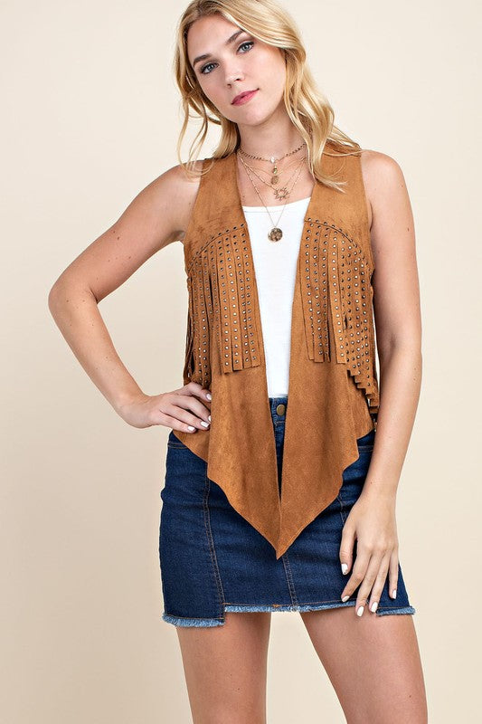 Stud Embellished Suede Fringe Hem Skirt | Camel