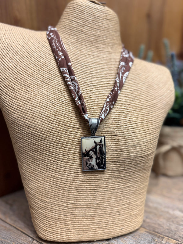 Vintage Western Photo Charm Scarf Necklace | Brown Bandana