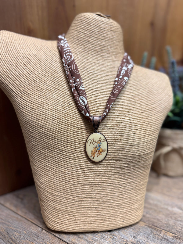 Western Rodeo Photo Charm Scarf Necklace | Brown Bandana