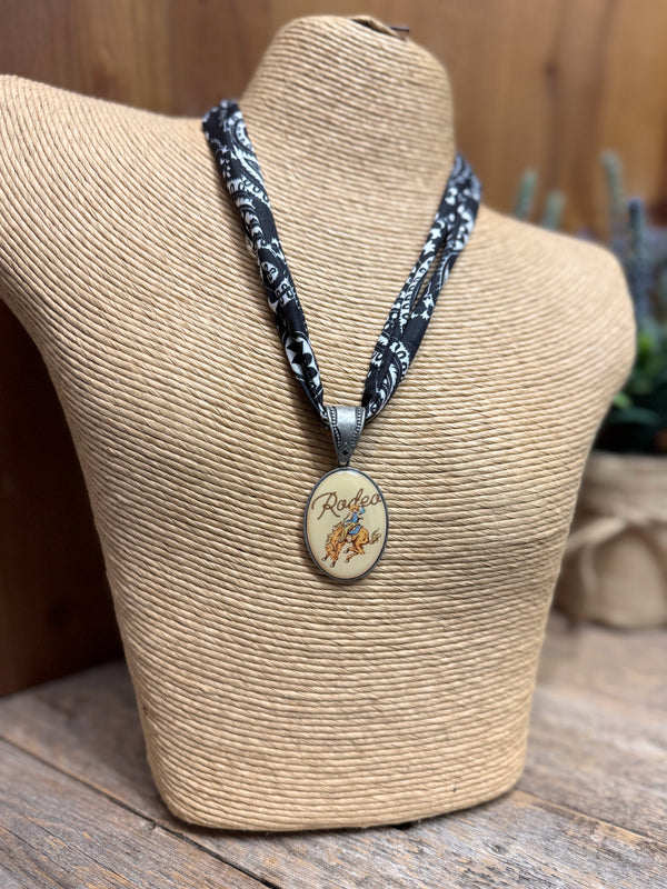 Western Rodeo Photo Charm Scarf Necklace | Black Bandana