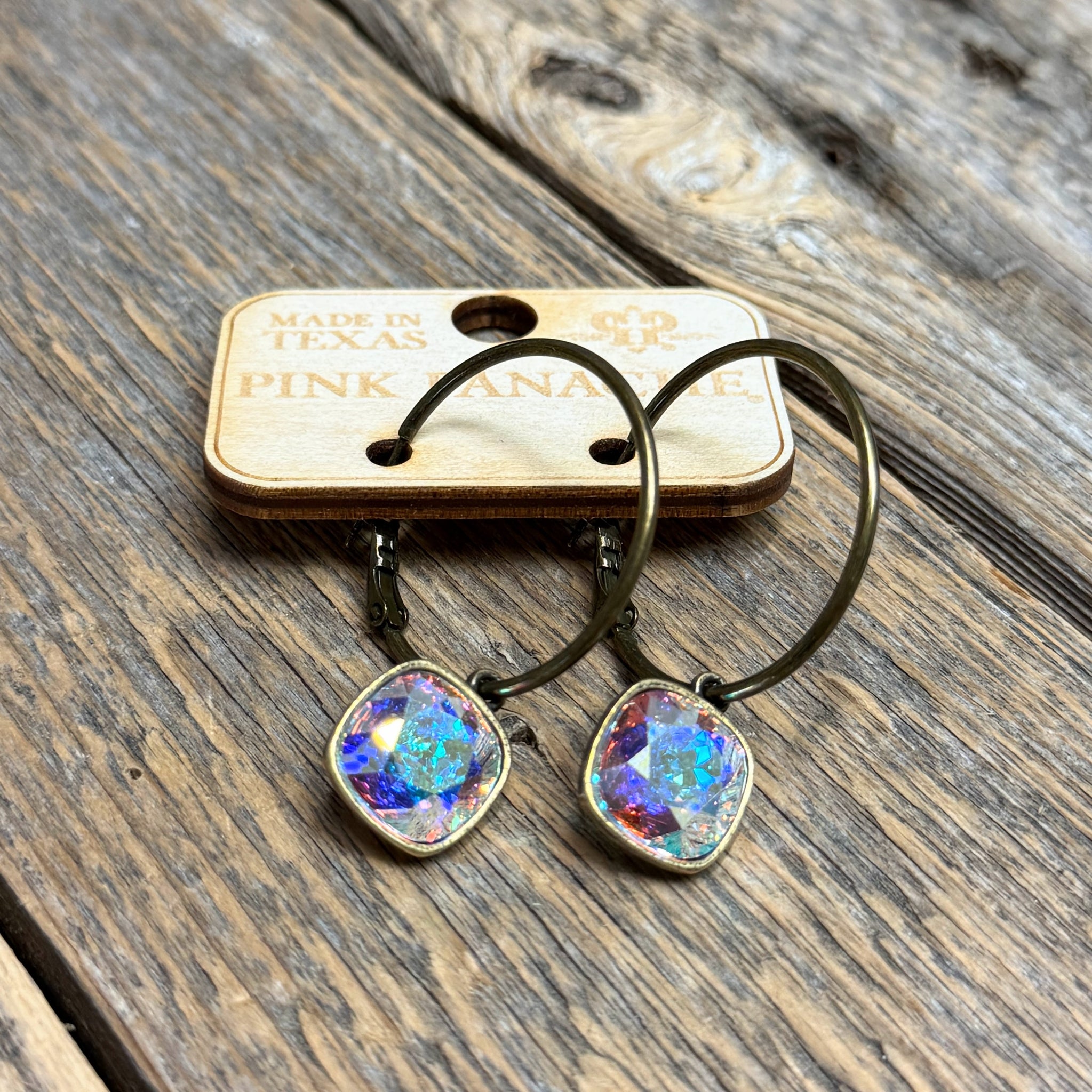 12mm cushion ab crystal hoop earrings in a bronze setting.