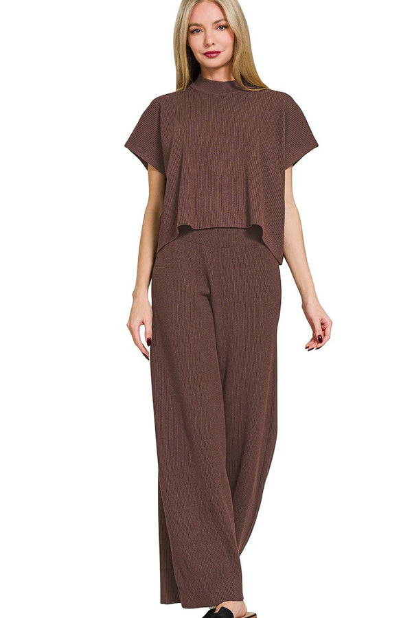 Ribbed Short Sleeve Sweater 2 Piece Set | Brown