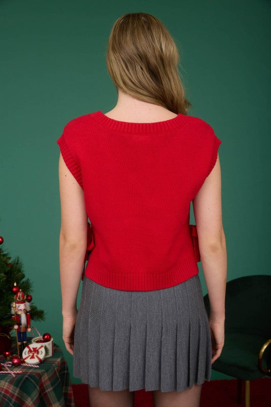 A cable knit sweater vest top featuring a v-neck and super cute side bow ties. Great to layer over your favorite long sleeve or cami!