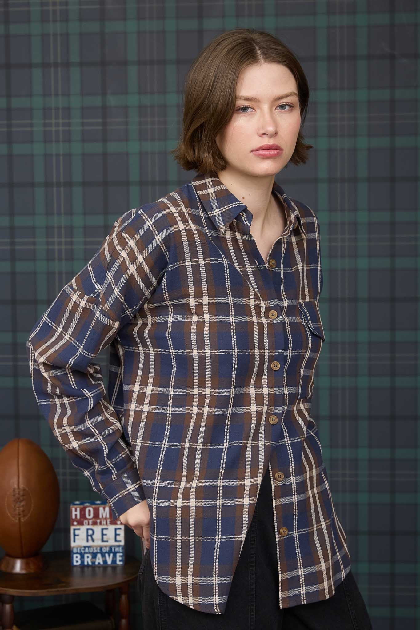 A plaid flannel style top featuring long sleeves, front pocket and buttons down the front.