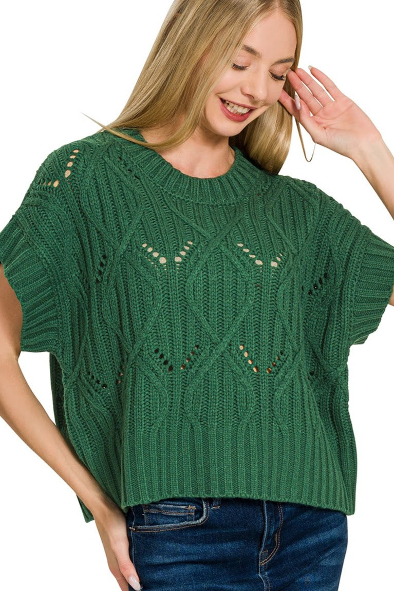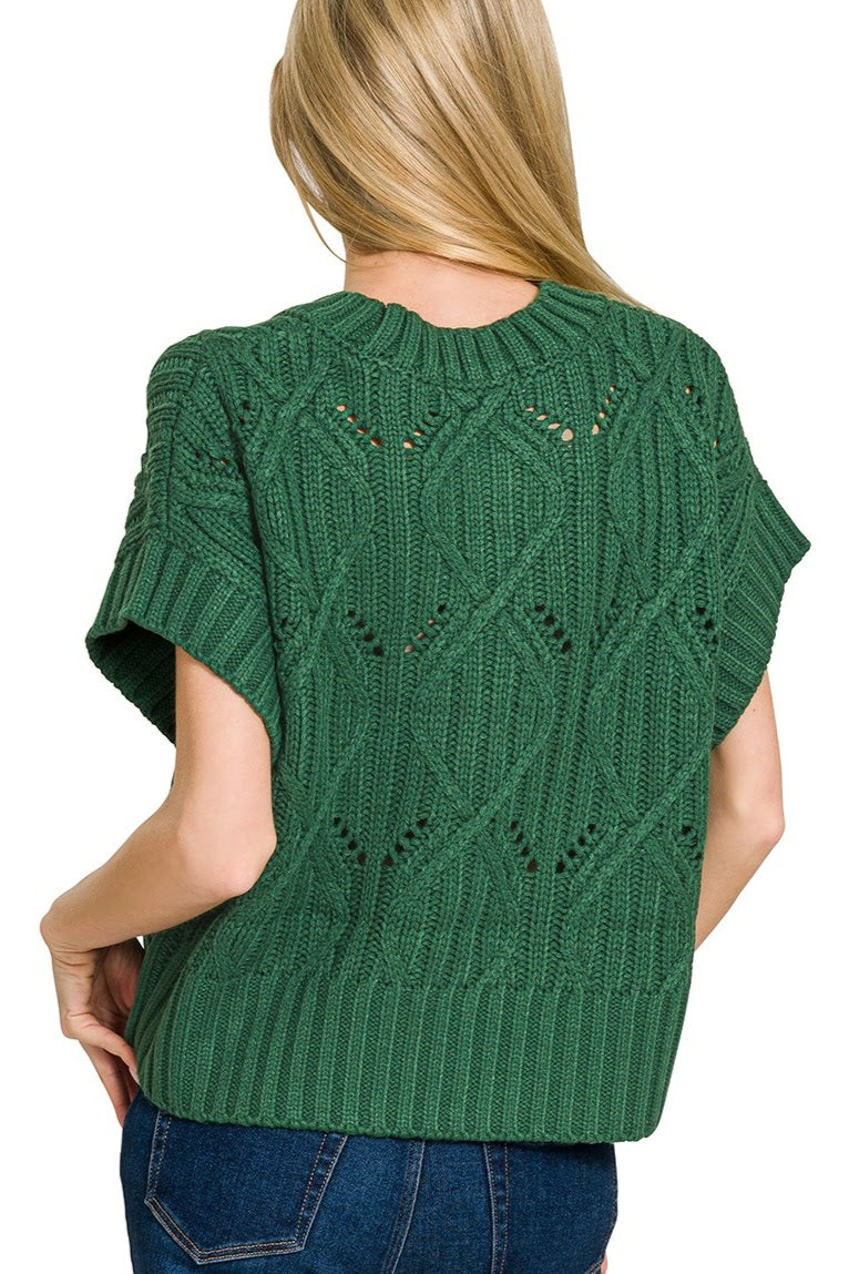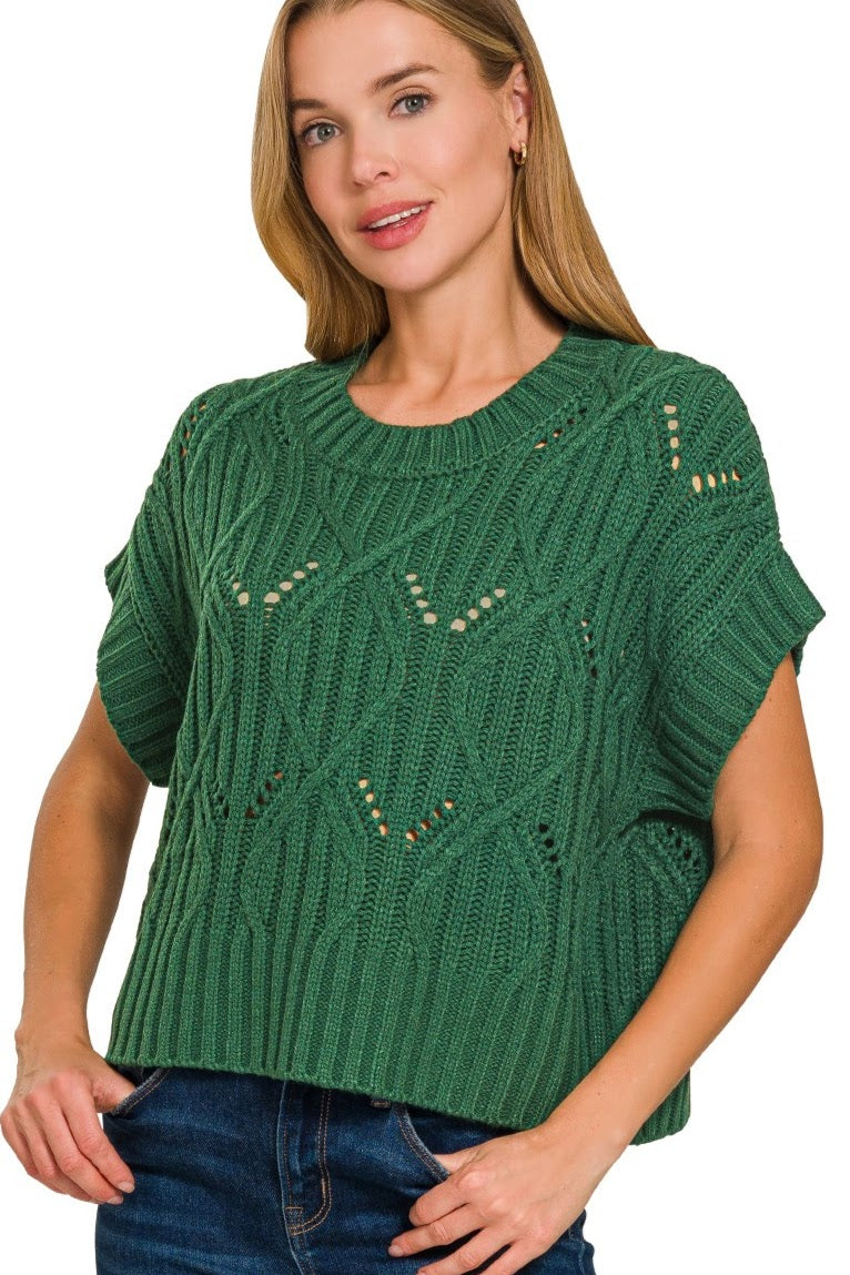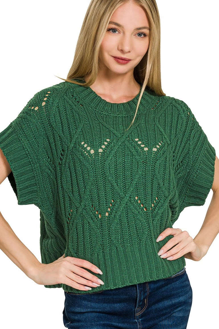 Cable Knit Short Sleeve Sweater Top | Dark Green