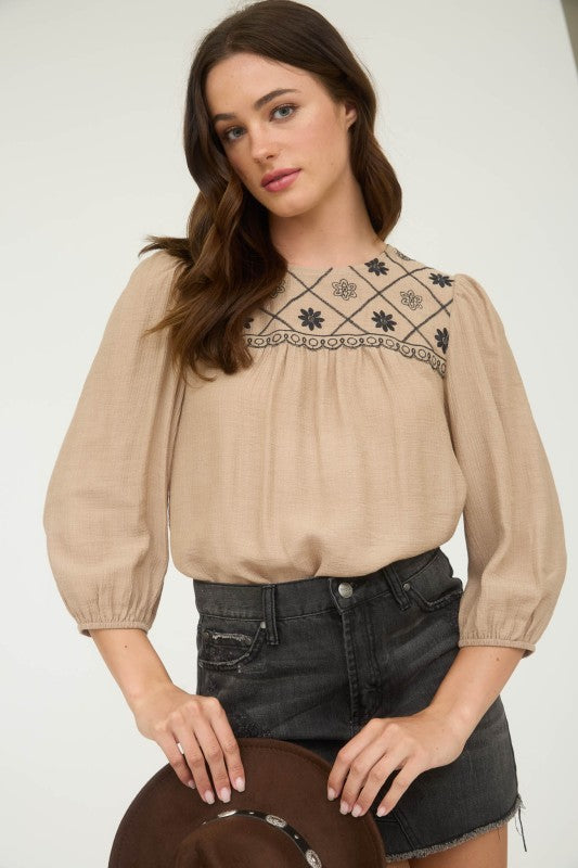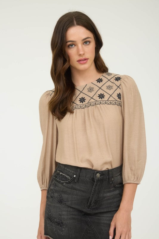 A lightweight floral embroidered yoke top featuring a 3/4 sleeve.