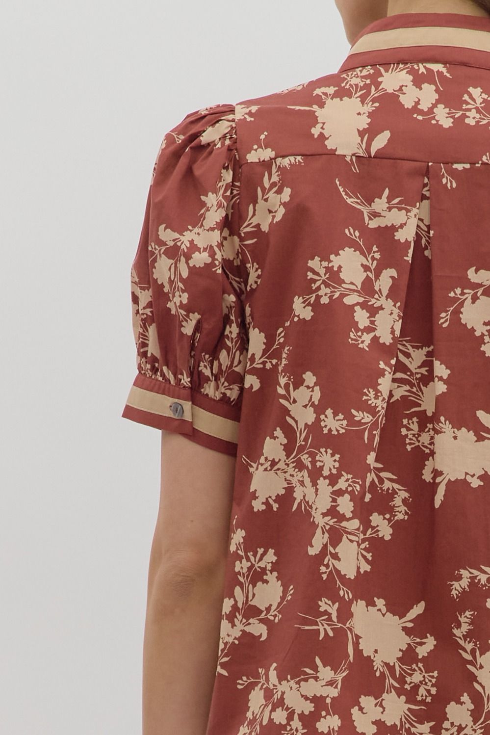 Floral print short puff sleeve top featuring multicolor accent V-neck band collar. Unlined. Woven.
