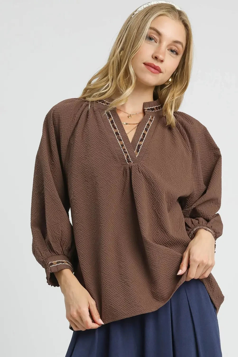 Leopard Trim V-Neck Top | Brown