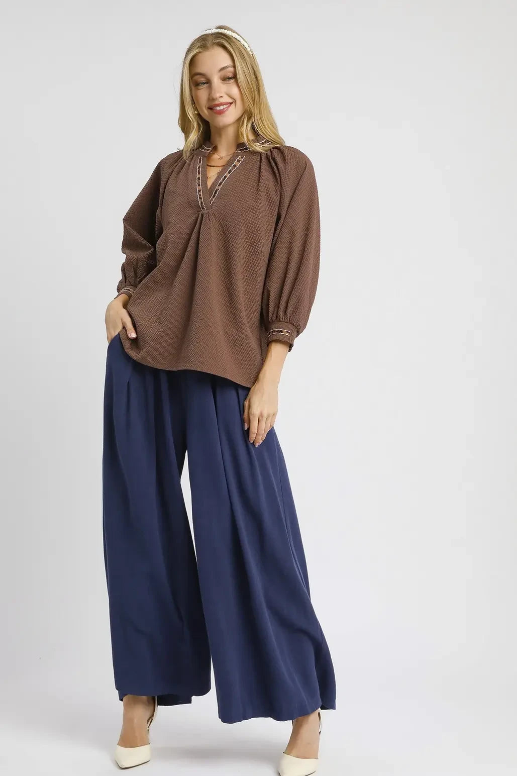 Puff Sleeves V Neck Collared Top